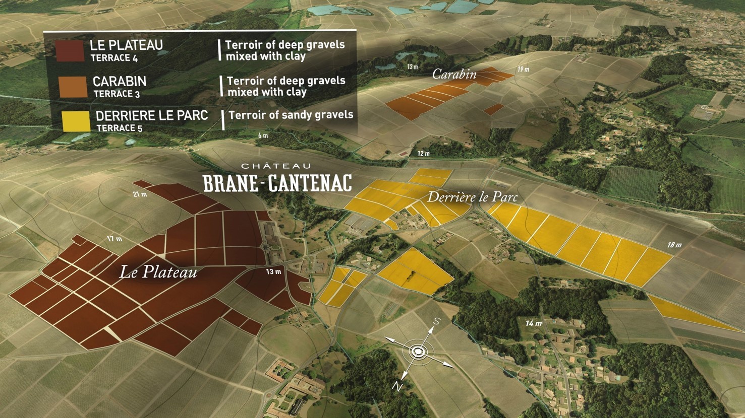 シャトーの前に広がる30ha位の区画はマルゴーでも特に優れた深い砂利質の土地で、砂利質の層は12mにも及び、根に水分が行き渡りすぎる事無く、長く深く伸びていきます。また表層が砂質である事により水はけがよいのも特徴です。
