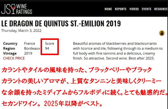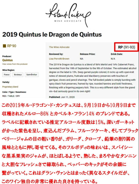 (フルボディ)オー・ブリオンを所有するドメーヌ・クラレンス・ディロン社が銘醸地サン・テミリオンで手掛けるシャトー・カンテュスのセカンドワイン。古代神話の守護神ドラゴンの名を冠しています。 ボルドー > サン・テミリオン A.O.C.サン・テミリオン・グラン・クリュ メルロー 85%/カベルネ・フラン 15% オーク樽熟成(新樽33.5%) 15.5% ワイン・アドヴォケイト90~82点